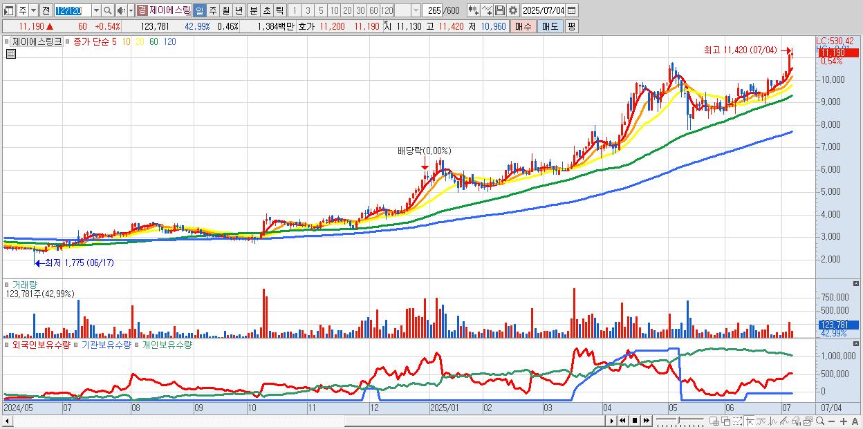 - 제이에스링크 (11,190원 ▲ 0.54% , 시총: 3,019억, 거래량: 123,781, 거래대금:14억, KOSDAQ)