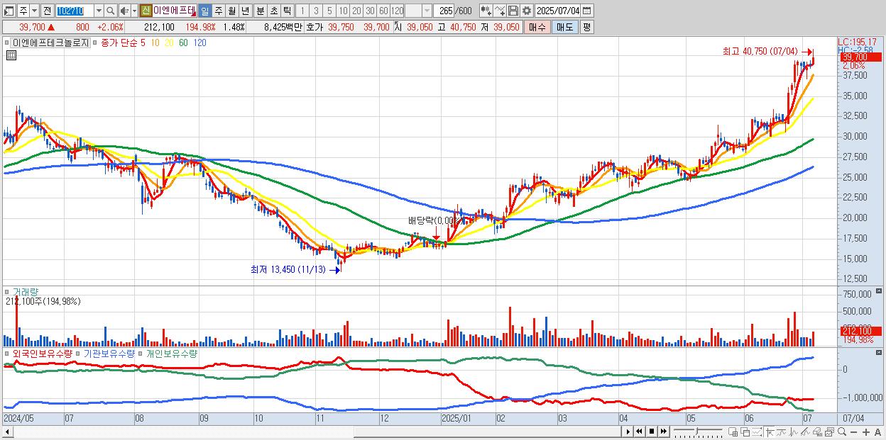 - 이엔에프테크놀로지 (39,600원 ▲ 1.8% , 시총: 5,658억, 거래량: 137,964, 거래대금:55억, KOSDAQ)