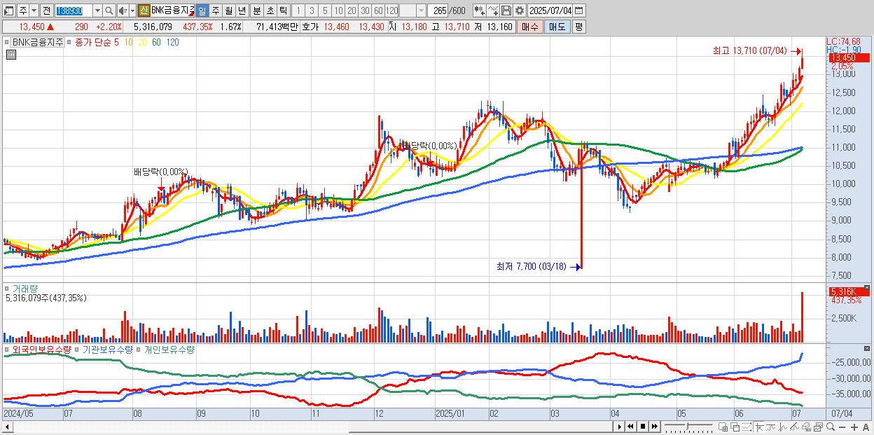 - BNK금융지주 (13,400원 ▲ 1.82% , 시총: 42,663억, 거래량: 5,041,966, 거래대금:677억, KOSPI)