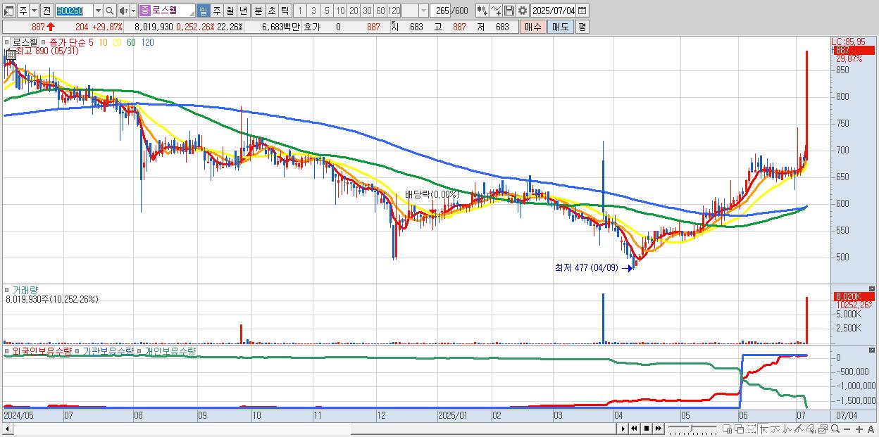 - 로스웰 (887원 ▲ 29.87% , 시총: 320억, 거래량: 8,019,930, 거래대금:67억, KOSDAQ)