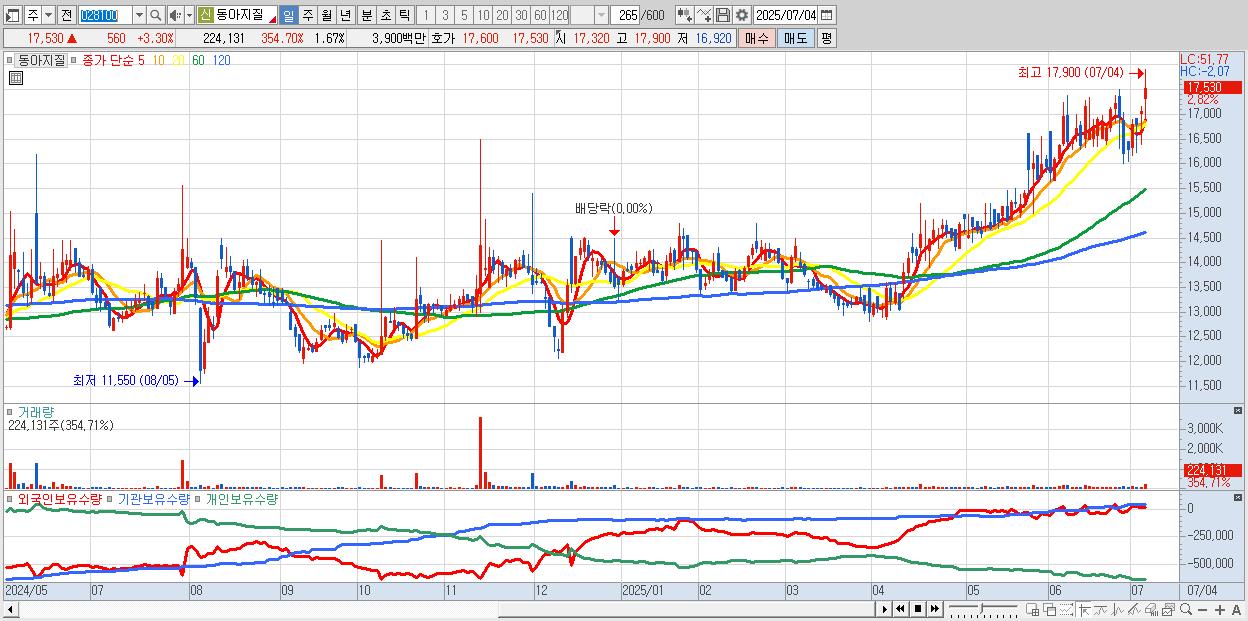 - 동아지질 (17,590원 ▲ 3.65% , 시총: 2,355억, 거래량: 113,843, 거래대금:20억, KOSPI)