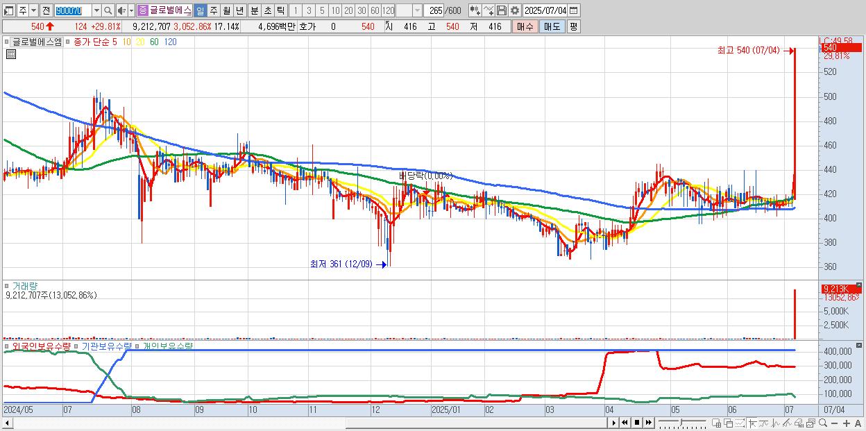 - 글로벌에스엠 (540원 ▲ 29.81% , 시총: 290억, 거래량: 9,212,707, 거래대금:47억, KOSDAQ)