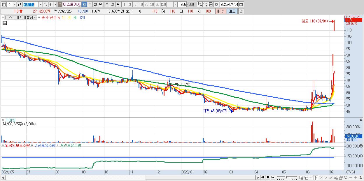 - 이스트아시아홀딩스 (118원 ▲ 29.67% , 시총: 758억, 거래량: 74,992,325, 거래대금:86억, KOSDAQ)