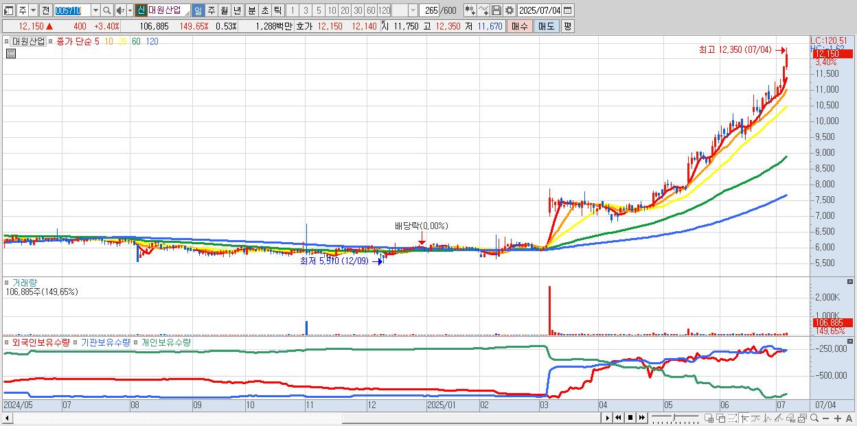 - 대원산업 (12,150원 ▲ 3.4% , 시총: 2,435억, 거래량: 106,885, 거래대금:13억, KOSDAQ)