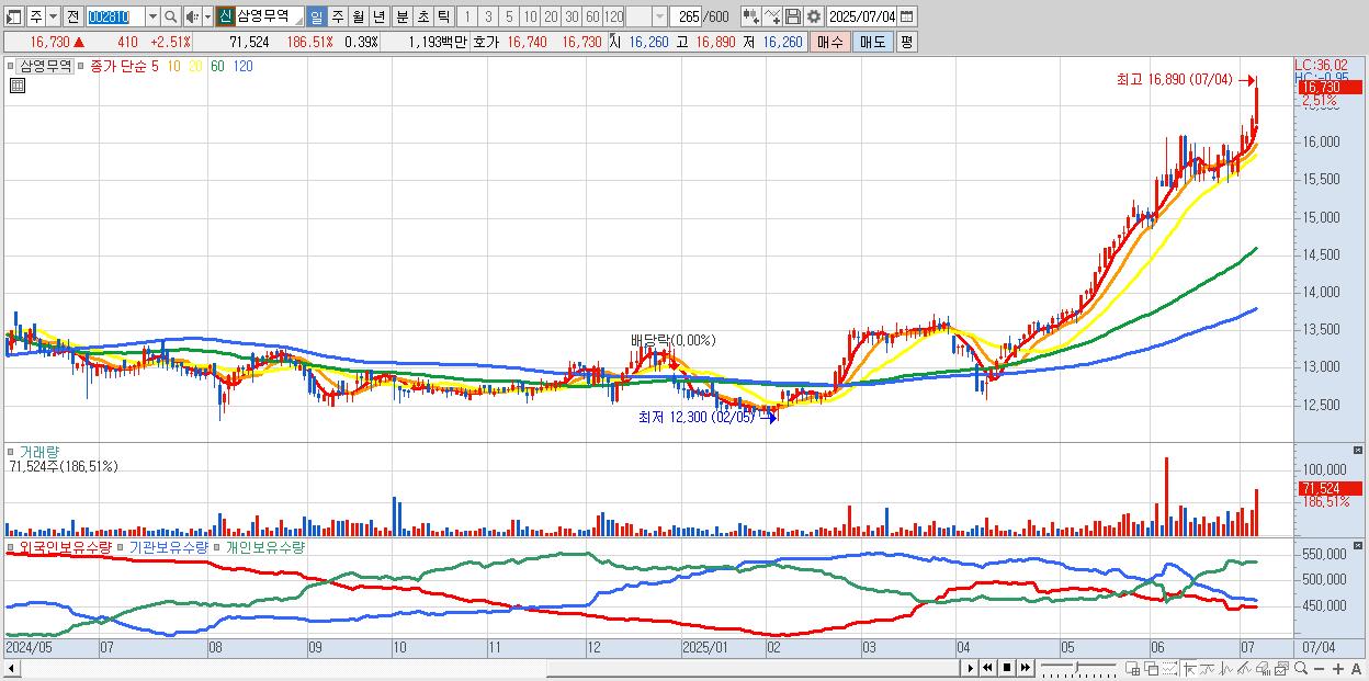 - 삼영무역 (16,730원 ▲ 2.51% , 시총: 3,090억, 거래량: 71,524, 거래대금:12억, KOSPI)