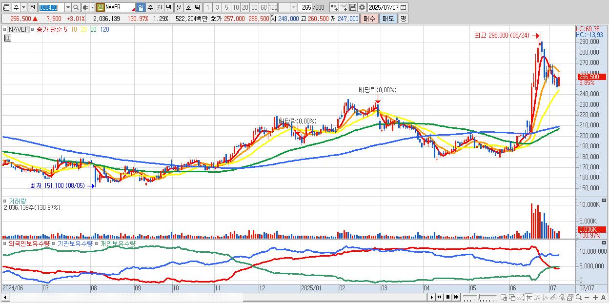 - NAVER (256,000원 ▲ 2.81% , 시총: 405,599억, 거래량: 1,175,356, 거래대금:3,018억)