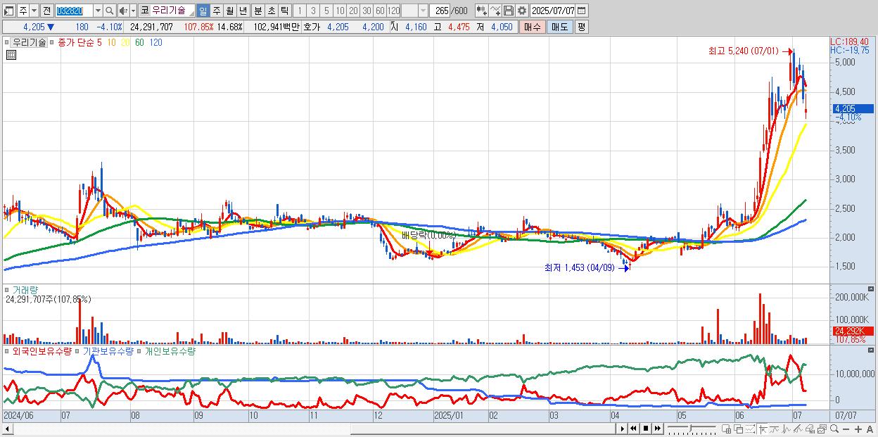 - 우리기술 (4,205원 ▼ -4.1% , 시총: 6,961억, 거래량: 24,291,707, 거래대금:1,029억)