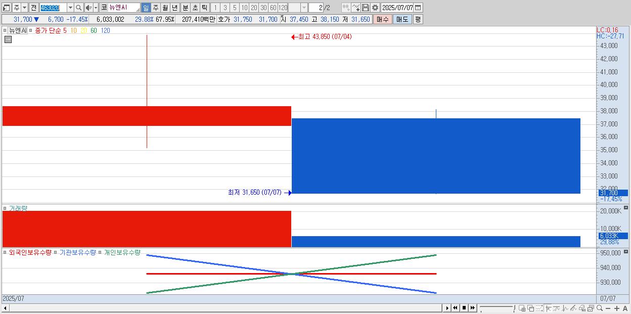 - 뉴엔AI (31,700원 ▼ -17.45% , 시총: 2,815억, 거래량: 6,033,002, 거래대금:2,074억)