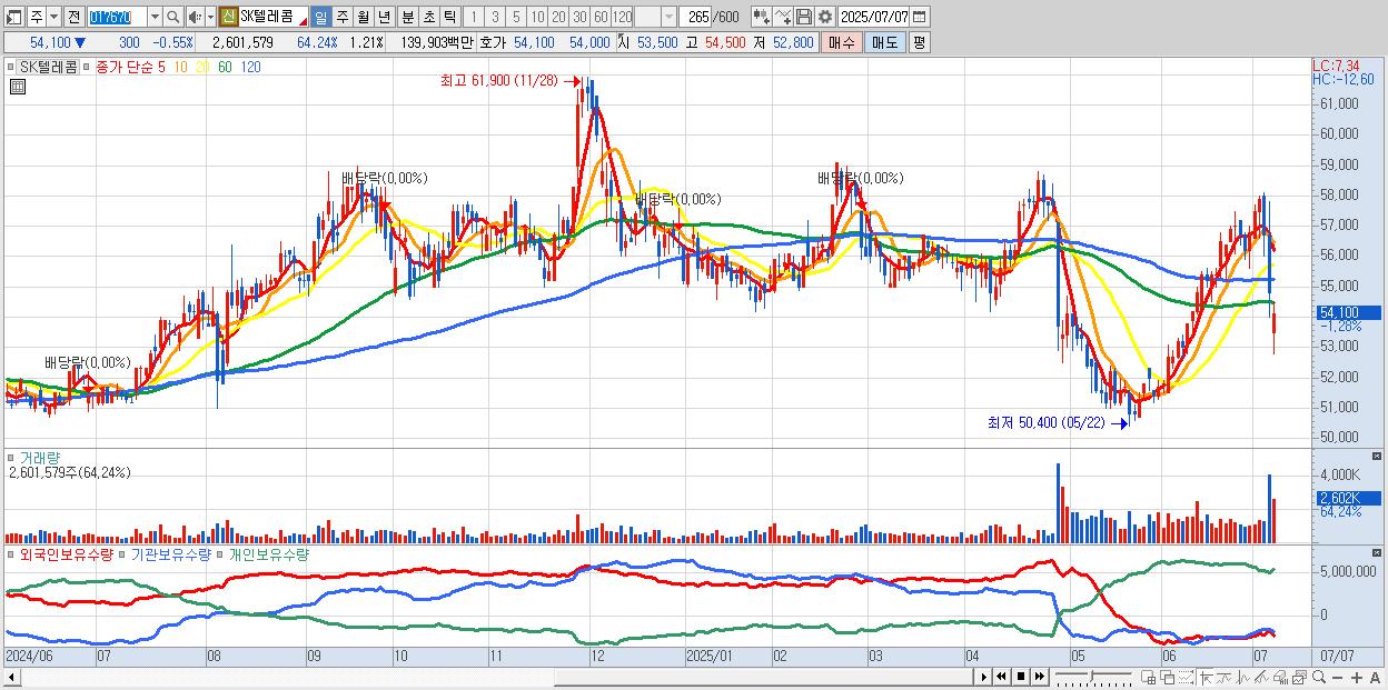 - SK텔레콤 (53,900원 ▼ -0.92% , 시총: 115,772억, 거래량: 1,812,868, 거래대금:975억)