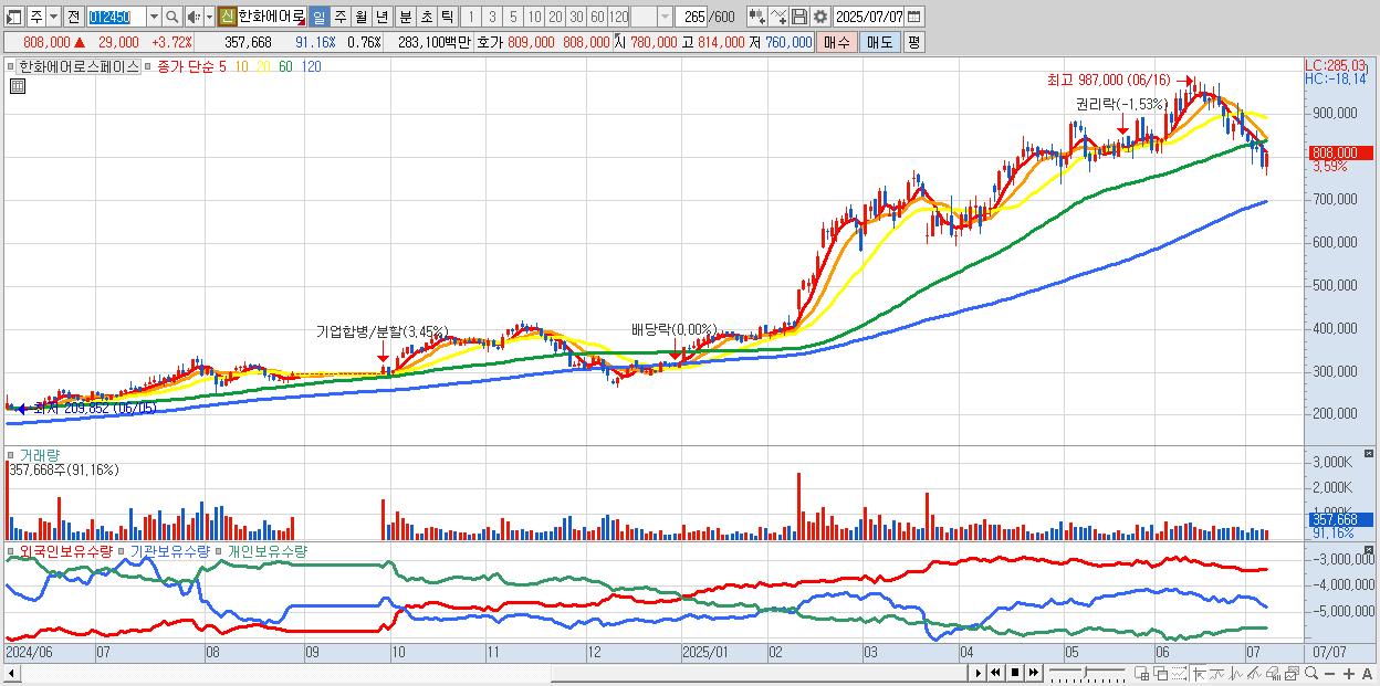 - 한화에어로스페이스 (805,000원 ▲ 3.34% , 시총: 380,734억, 거래량: 273,998, 거래대금:2,171억)