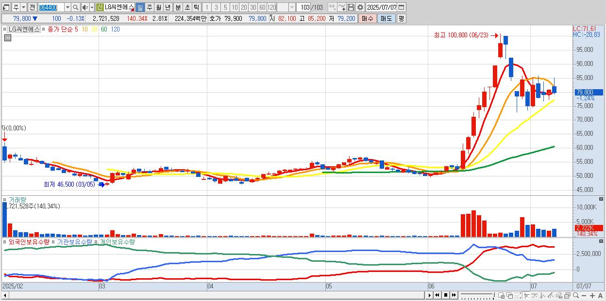 - LG씨엔에스 (79,400원 ▼ -0.63% , 시총: 76,927억, 거래량: 1,325,075, 거래대금:1,092억)