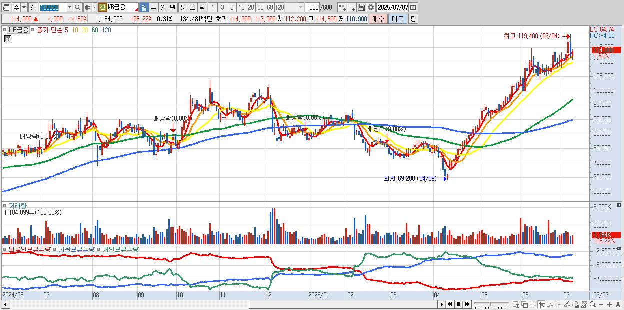 - KB금융 (114,400원 ▲ 2.05% , 시총: 436,393억, 거래량: 1,096,768, 거래대금:1,246억)