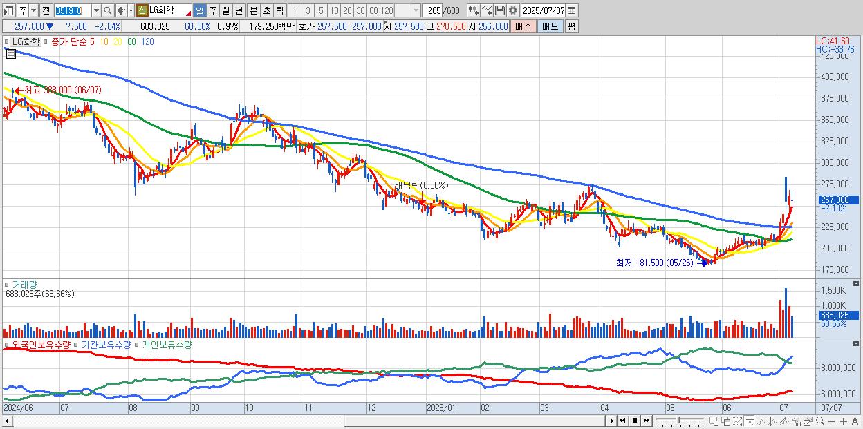 - LG화학 (258,500원 ▼ -2.27% , 시총: 182,481억, 거래량: 514,957, 거래대금:1,352억)