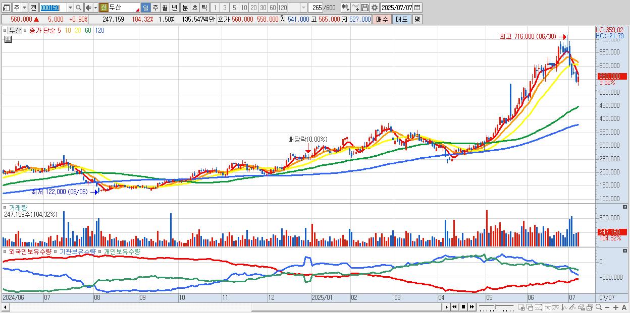 - 두산 (560,000원 ▲ 0.9% , 시총: 92,533억, 거래량: 183,070, 거래대금:1,005억)