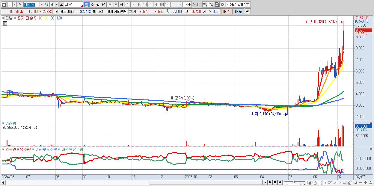 - 다날 (9,710원 ▲ 14.64% , 시총: 6,695억, 거래량: 44,355,509, 거래대금:4,314억)