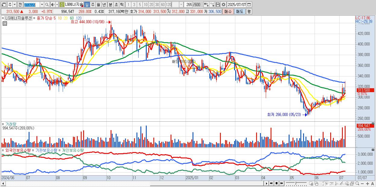 - LG에너지솔루션 (315,000원 ▲ 1.45% , 시총: 737,100억, 거래량: 610,772, 거래대금:1,947억)