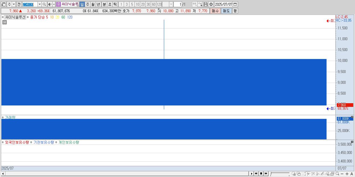 - 싸이닉솔루션 (7,960원 ▲ 69.36% , 시총: 1,879억, 거래량: 61,807,676, 거래대금:6,343억)