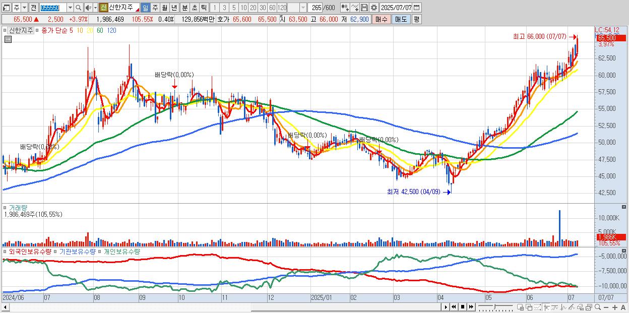 - 신한지주 (66,000원 ▲ 4.76% , 시총: 327,256억, 거래량: 1,734,023, 거래대금:1,134억)