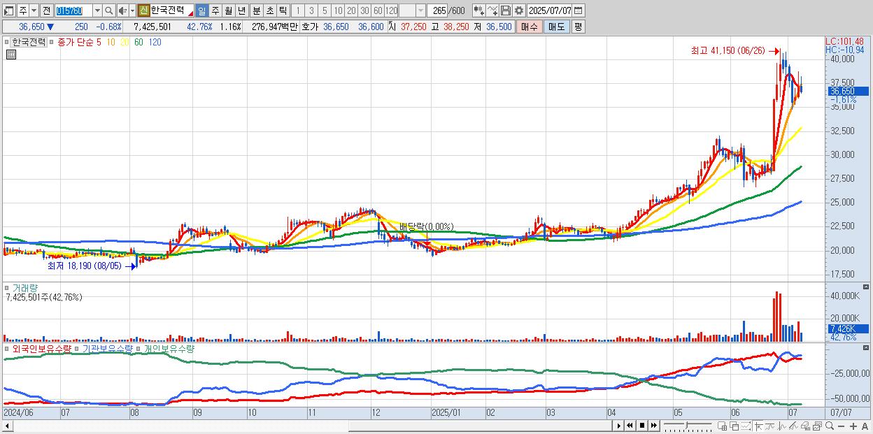 - 한국전력 (37,000원 ▲ 0.27% , 시총: 237,527억, 거래량: 3,875,908, 거래대금:1,443억)