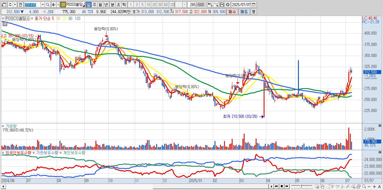 - POSCO홀딩스 (313,500원 ▼ -0.95% , 시총: 253,725억, 거래량: 497,135, 거래대금:1,569억)