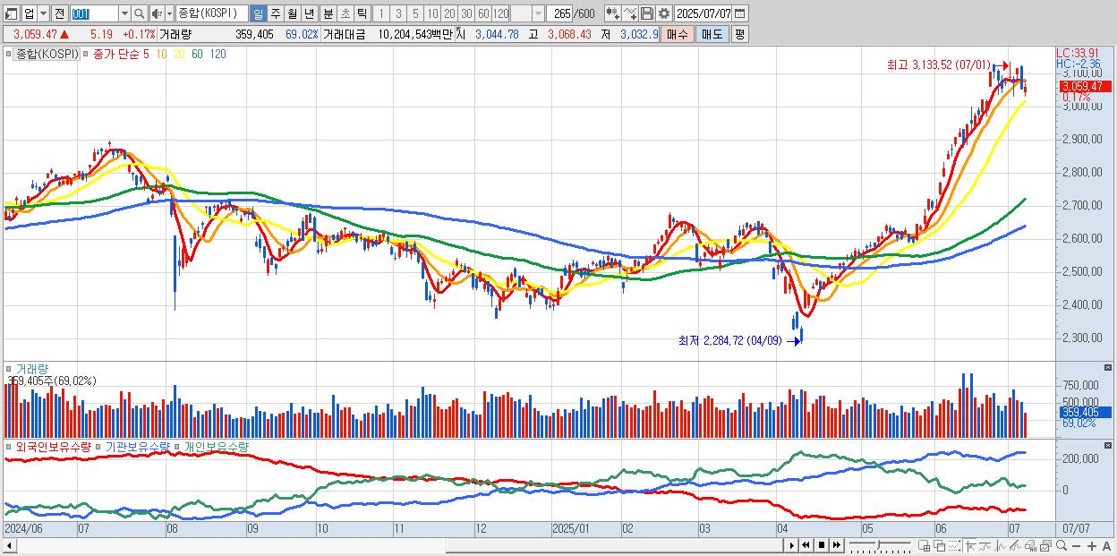 | 07/07 | 3,059.47 | ▲0.17% | 1,558억 | -937억 | -811억 | 189억 |