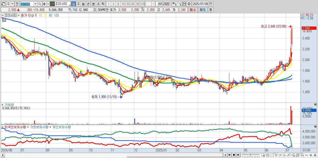 - 조이시티 (2,590원 ▲ 16.4% , 시총: 1,810억, 거래량: 9,044,958, 거래대금:225억)