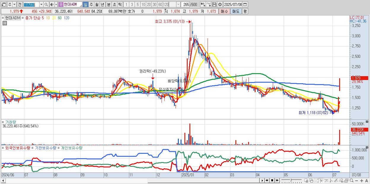 - 현대ADM (1,979원 ▲ 29.94% , 시총: 851억, 거래량: 36,220,461, 거래대금:691억)