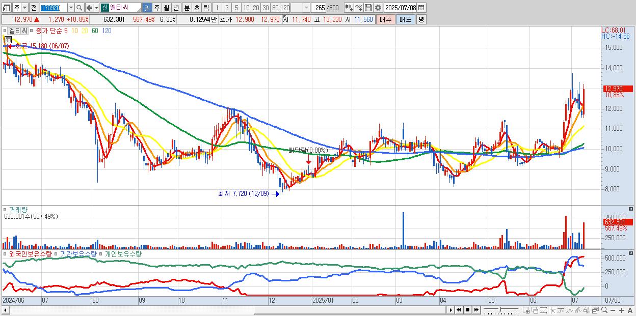 - 엘티씨 (12,970원 ▲ 10.85% , 시총: 1,295억, 거래량: 632,301, 거래대금:81억)