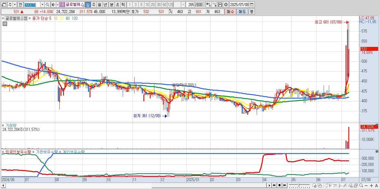 - 글로벌에스엠 (531원 ▲ 14.69% , 시총: 285억, 거래량: 24,722,284, 거래대금:140억)