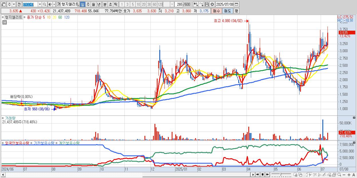 - 형지엘리트 (3,635원 ▲ 13.42% , 시총: 1,395억, 거래량: 21,437,489, 거래대금:778억)