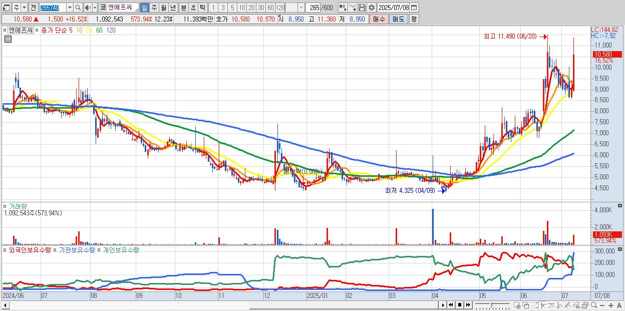 - 엔에프씨 (10,580원 ▲ 16.52% , 시총: 945억, 거래량: 1,092,543, 거래대금:114억)