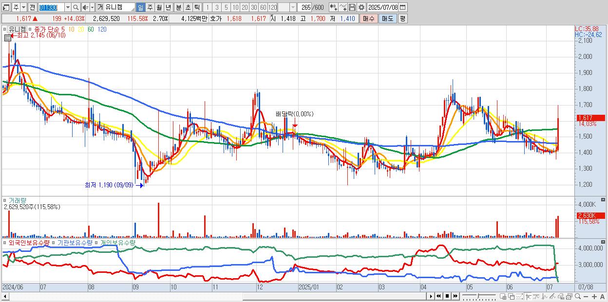 - 유니켐 (1,617원 ▲ 14.03% , 시총: 1,573억, 거래량: 2,629,520, 거래대금:41억)