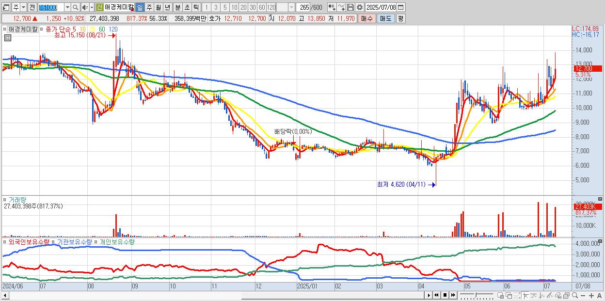 - 애경케미칼 (12,800원 ▲ 11.79% , 시총: 6,227억, 거래량: 13,320,197, 거래대금:1,754억)