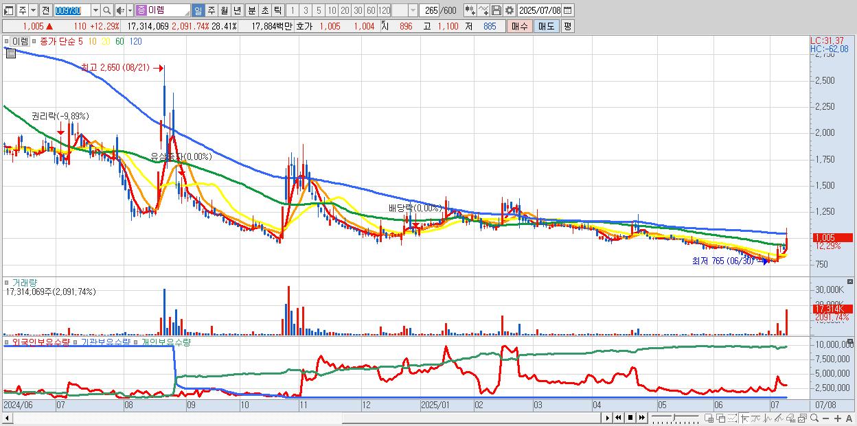 - 이렘 (1,005원 ▲ 12.29% , 시총: 612억, 거래량: 17,314,069, 거래대금:179억)