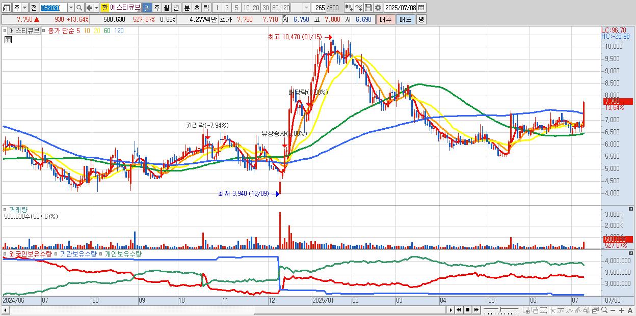 - 에스티큐브 (7,750원 ▲ 13.64% , 시총: 5,269억, 거래량: 580,630, 거래대금:43억)