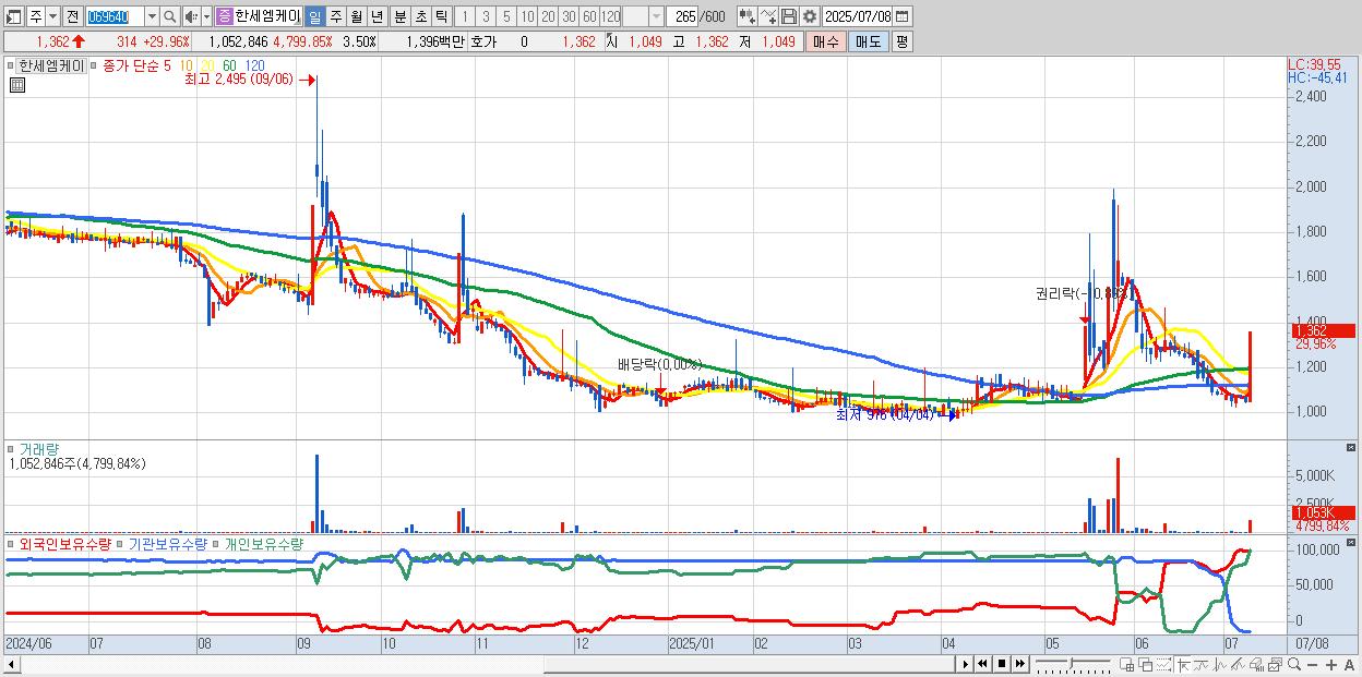 1.한세엠케이 1,362원 ▲ 29.96% (KOSPI, 069640)