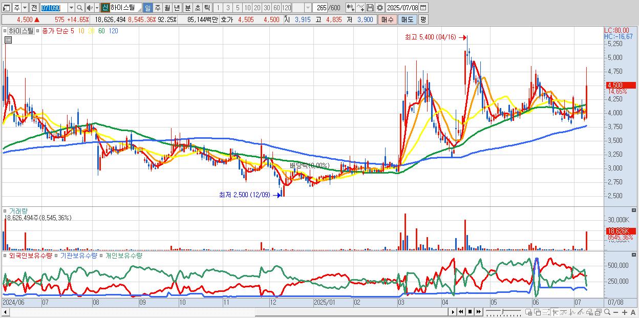 - 하이스틸 (4,500원 ▲ 14.65% , 시총: 909억, 거래량: 18,626,494, 거래대금:851억)