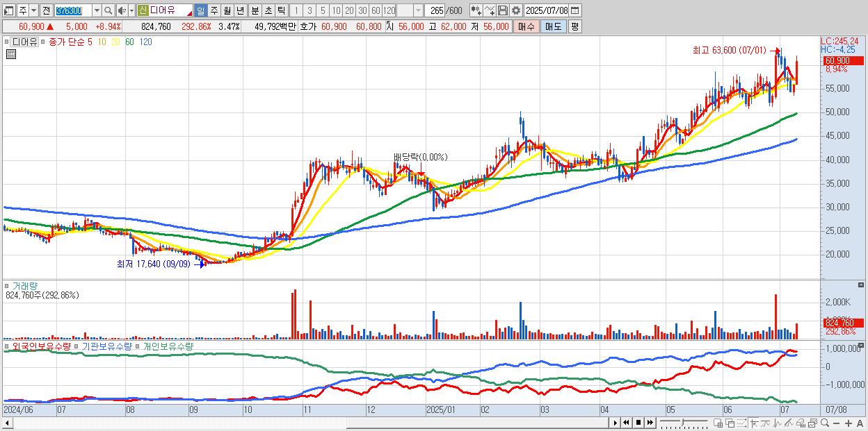 - 디어유 (61,900원 ▲ 10.73% , 시총: 14,694억, 거래량: 631,254, 거래대금:382억)