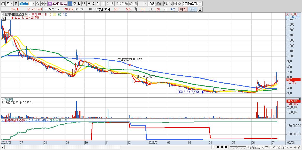 - 오가닉티코스메틱 (557원 ▲ 10.74% , 시총: 535억, 거래량: 31,507,712, 거래대금:183억)