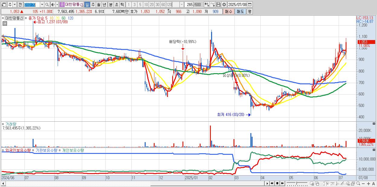 - 대한광통신 (1,053원 ▲ 11.08% , 시총: 1,153억, 거래량: 7,563,495, 거래대금:77억)