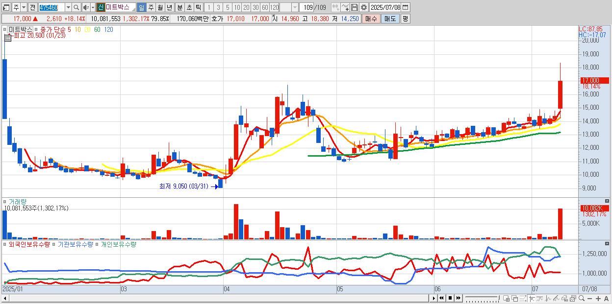 - 미트박스 (17,000원 ▲ 18.14% , 시총: 953억, 거래량: 10,081,553, 거래대금:1,701억)