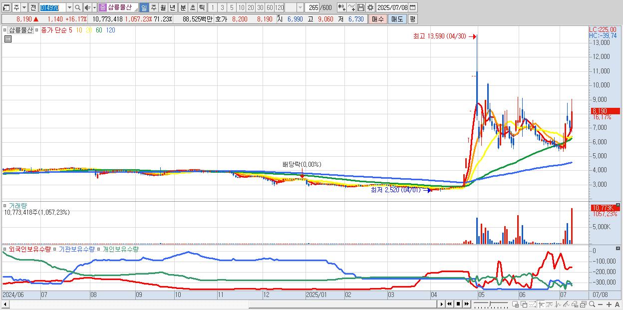 - 삼륭물산 (8,190원 ▲ 16.17% , 시총: 1,239억, 거래량: 10,773,418, 거래대금:885억)
