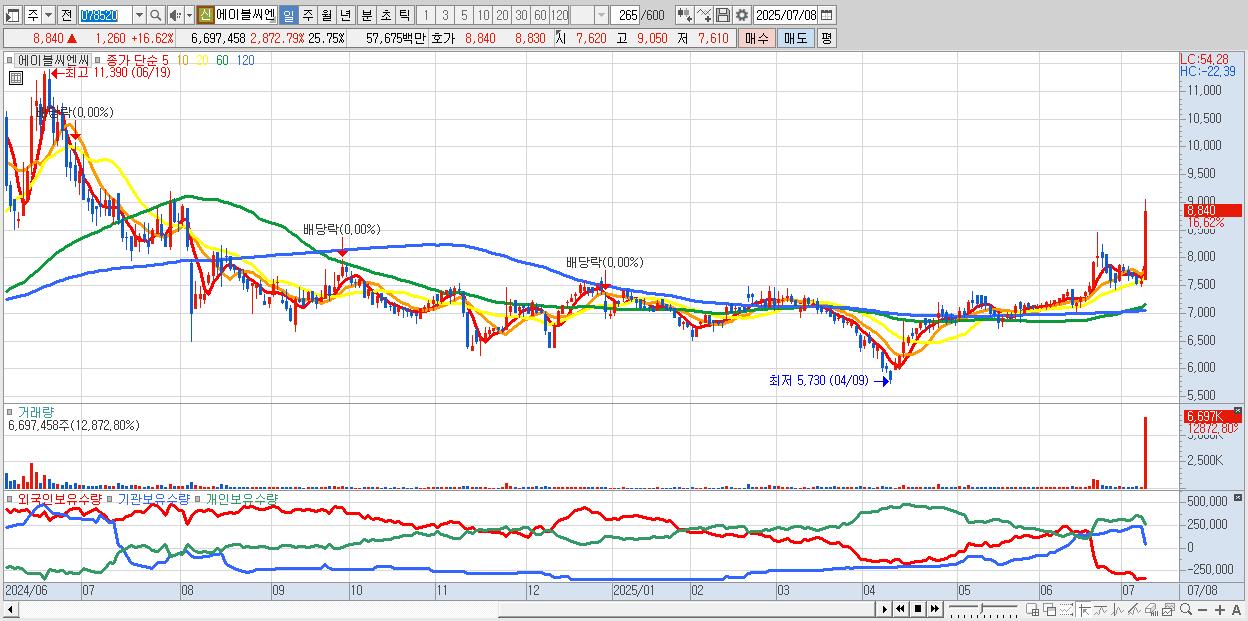 - 에이블씨엔씨 (8,840원 ▲ 16.62% , 시총: 2,300억, 거래량: 6,697,458, 거래대금:577억)