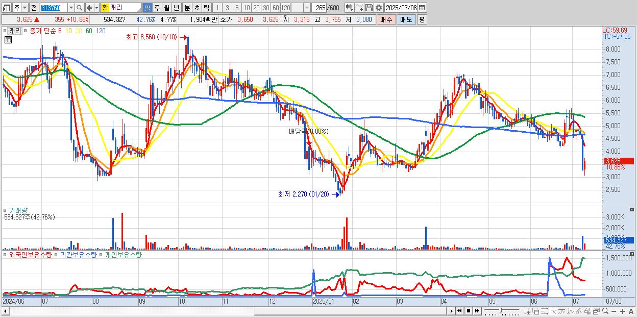 - 캐리 (3,625원 ▲ 10.86% , 시총: 406억, 거래량: 534,327, 거래대금:19억)