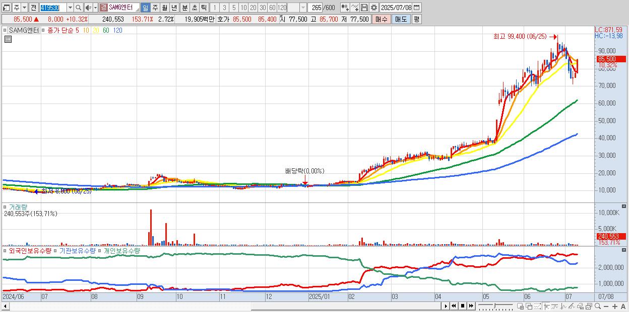 - SAMG엔터 (85,500원 ▲ 10.32% , 시총: 7,556억, 거래량: 240,553, 거래대금:199억)