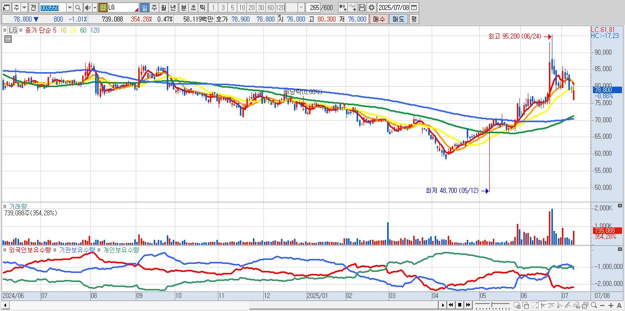 - LG (78,900원 ▼ -0.88% , 시총: 124,071억, 외국인 순매수 거래금:64억)