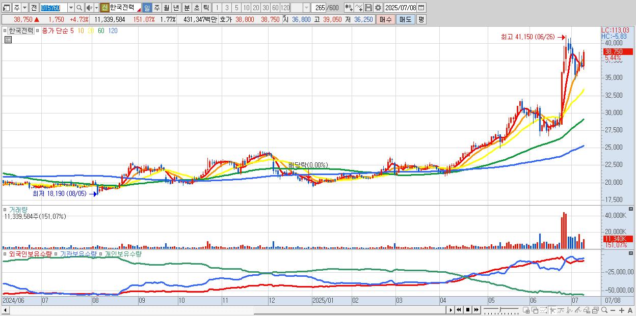 - 한국전력 (38,650원 ▲ 4.46% , 시총: 248,119억, 외국인 순매수 거래금:196억)