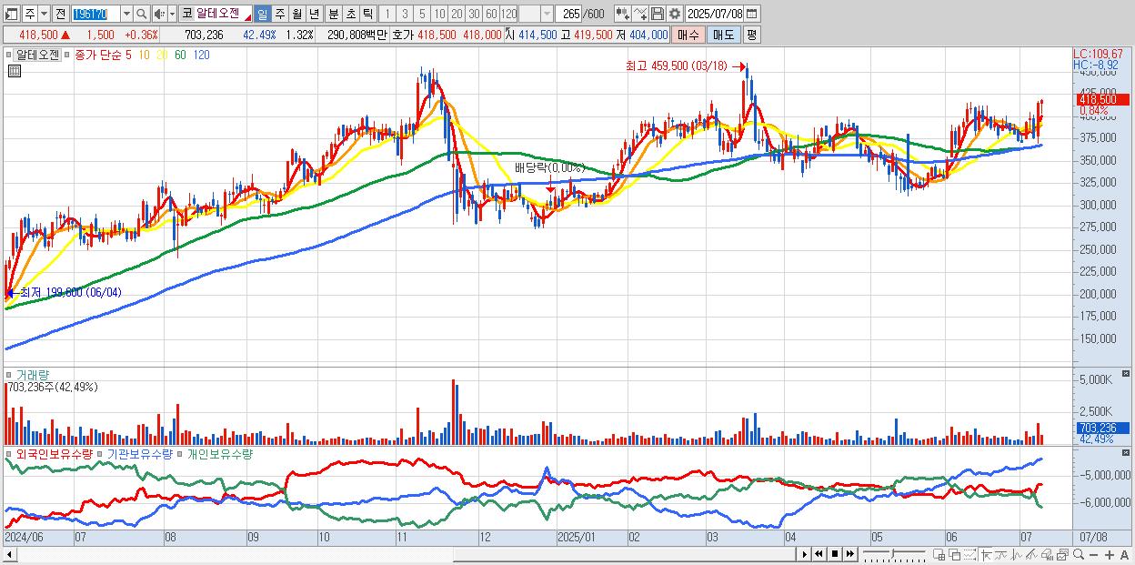 - 알테오젠 (419,000원 ▲ 0.48% , 시총: 224,018억, 외국인 순매수 거래금:170억)