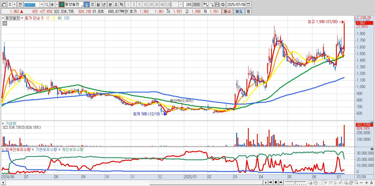 - 동양철관 (1,962원 ▲ 27.65% , 시총: 3,135억, 외국인 순매수 거래금:211억)