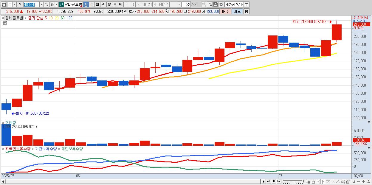 - 달바글로벌 (213,500원 ▲ 9.43% , 시총: 25,836억, 외국인 순매수 거래금:144억)